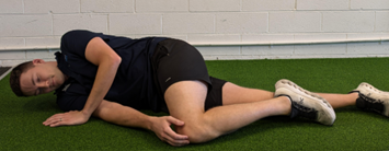Step 3: Push the bent leg into the floor and bring your arm across your body as you let your knee drop across, this will help roll you into side lying.